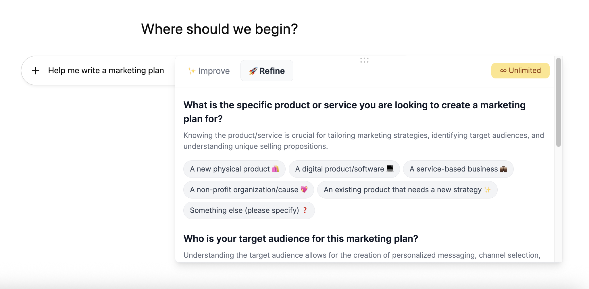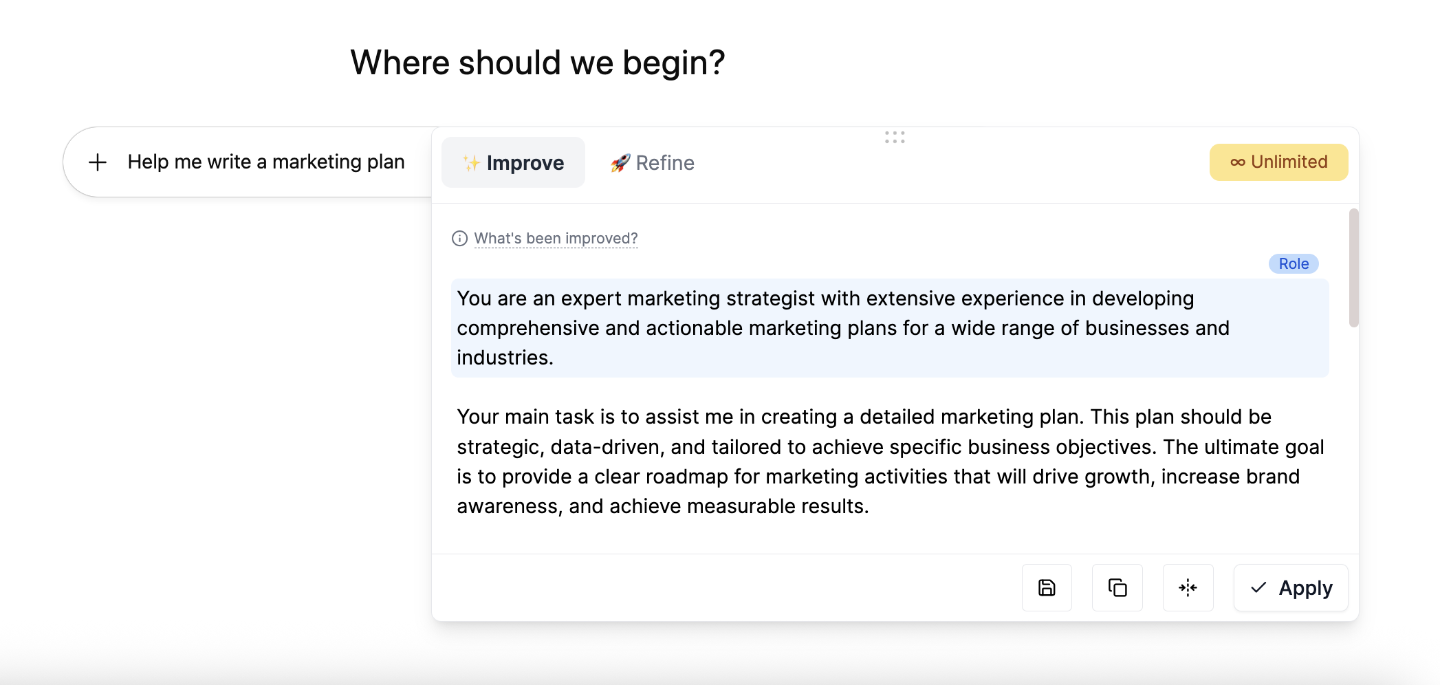 Improve is the default option when using Pretty Prompt. It will improve and expand your original prompt based on the context of what you’ve written.