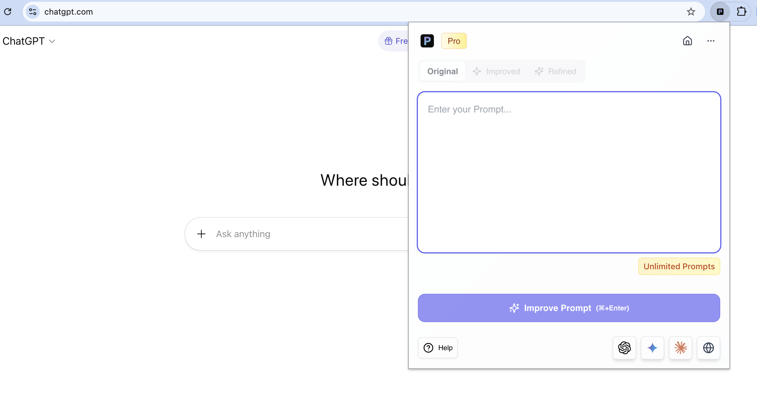 Prompt-from-anywhere - with the browser extension, you can also access prompt improvement anywhere on the web by clicking on the Pretty Prompt logo in your extensions toolbar.